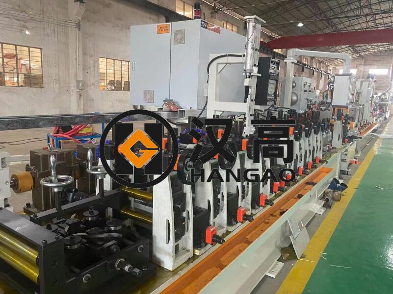 通過上料機(jī)將帶料引入焊管機(jī),通過輥輪將帶料擠壓成形,然后用砑弧焊混合氣體保護(hù)焊接、校圓,輸出需要長(zhǎng)度的管材,切刀機(jī)構(gòu)切斷,再經(jīng)調(diào)直機(jī)調(diào)直。點(diǎn)焊機(jī)用于帶料頭之間進(jìn)行點(diǎn)焊連接。該型制管機(jī)是將帶料連續(xù)不斷的焊接成管材,并校圓調(diào)直的綜合性的成套設(shè)備。
